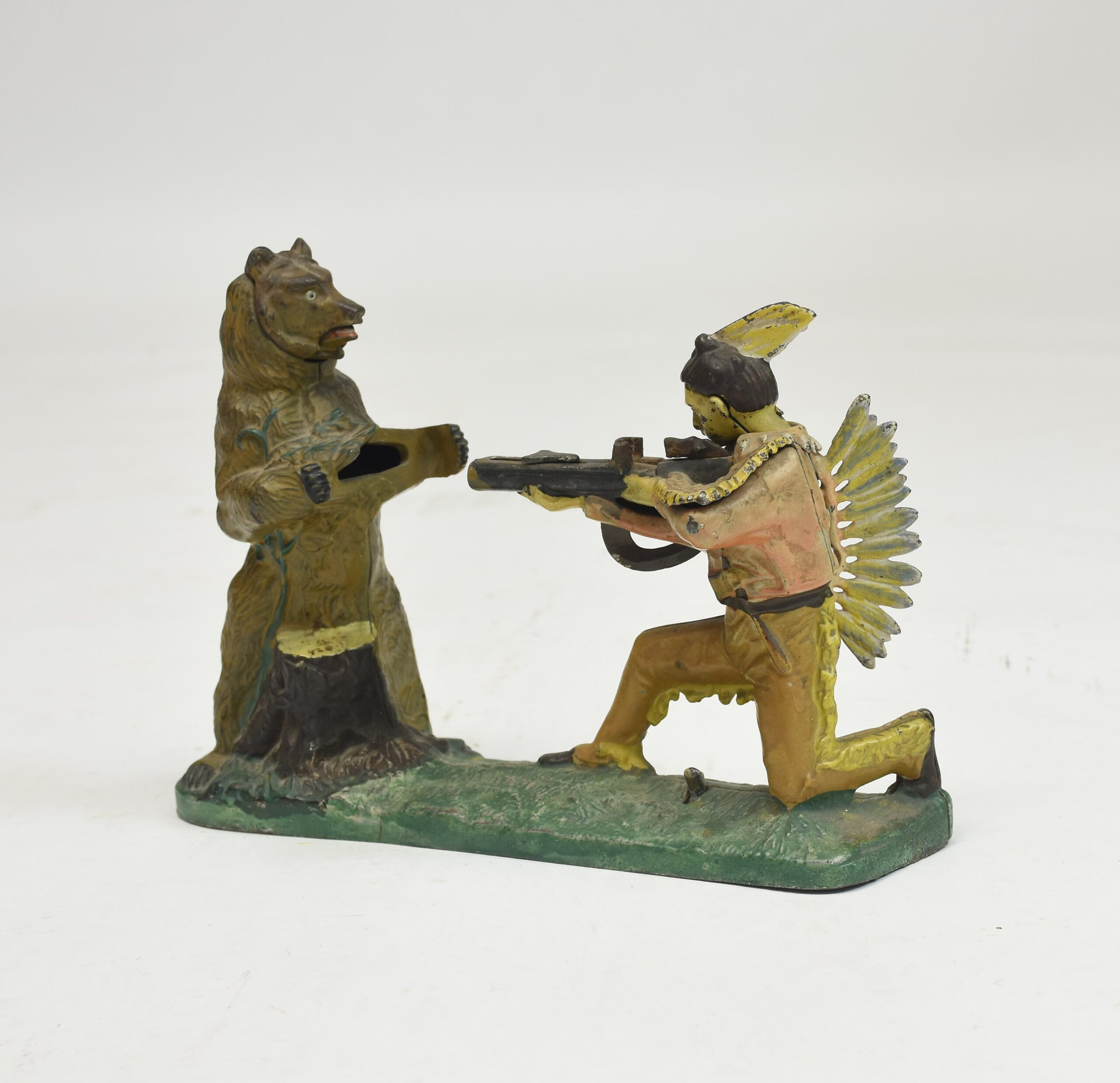 19th C. painted cast iron mechanical bank, Indian and the bear, 10″ x 8″