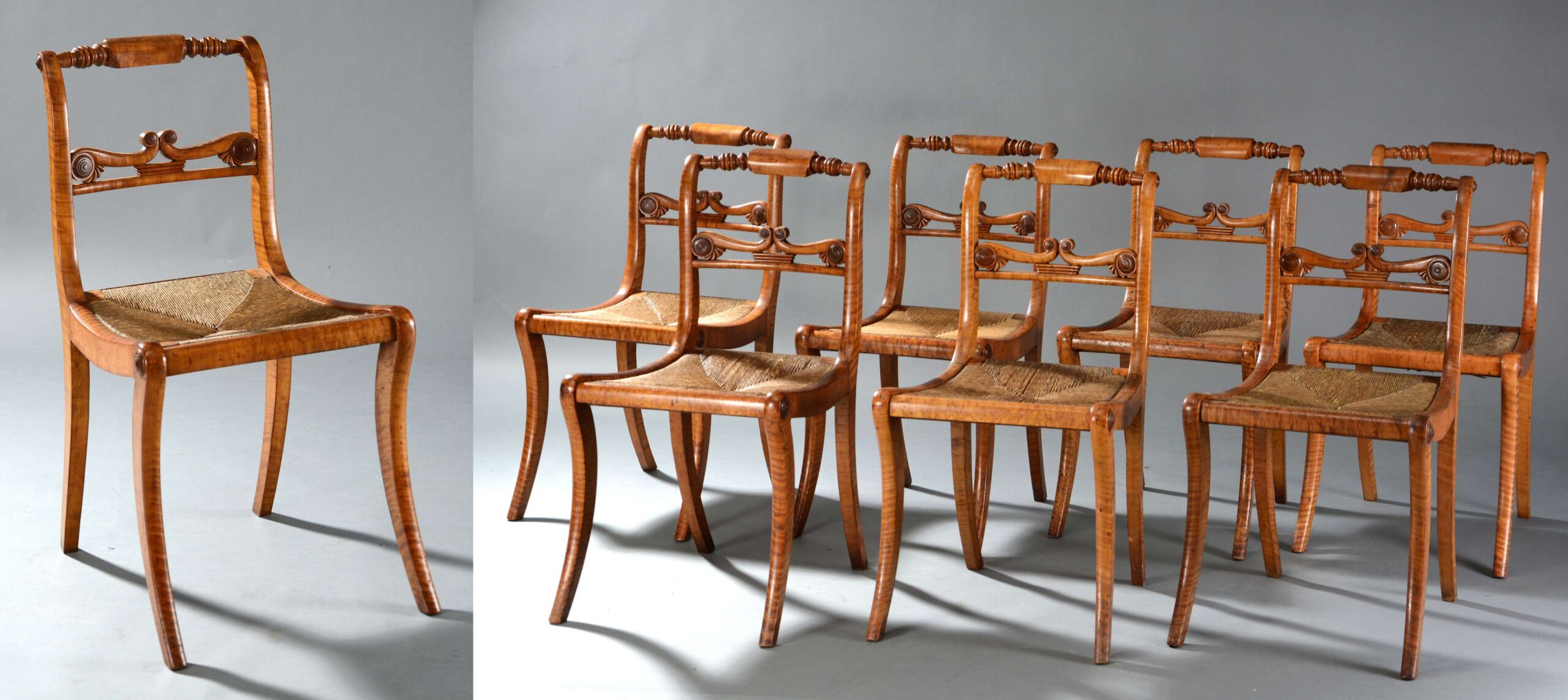 Choice set of eight American Federal carved back dining chairs in tiger maple with saber legs, ca.1830, see previous sales receipt