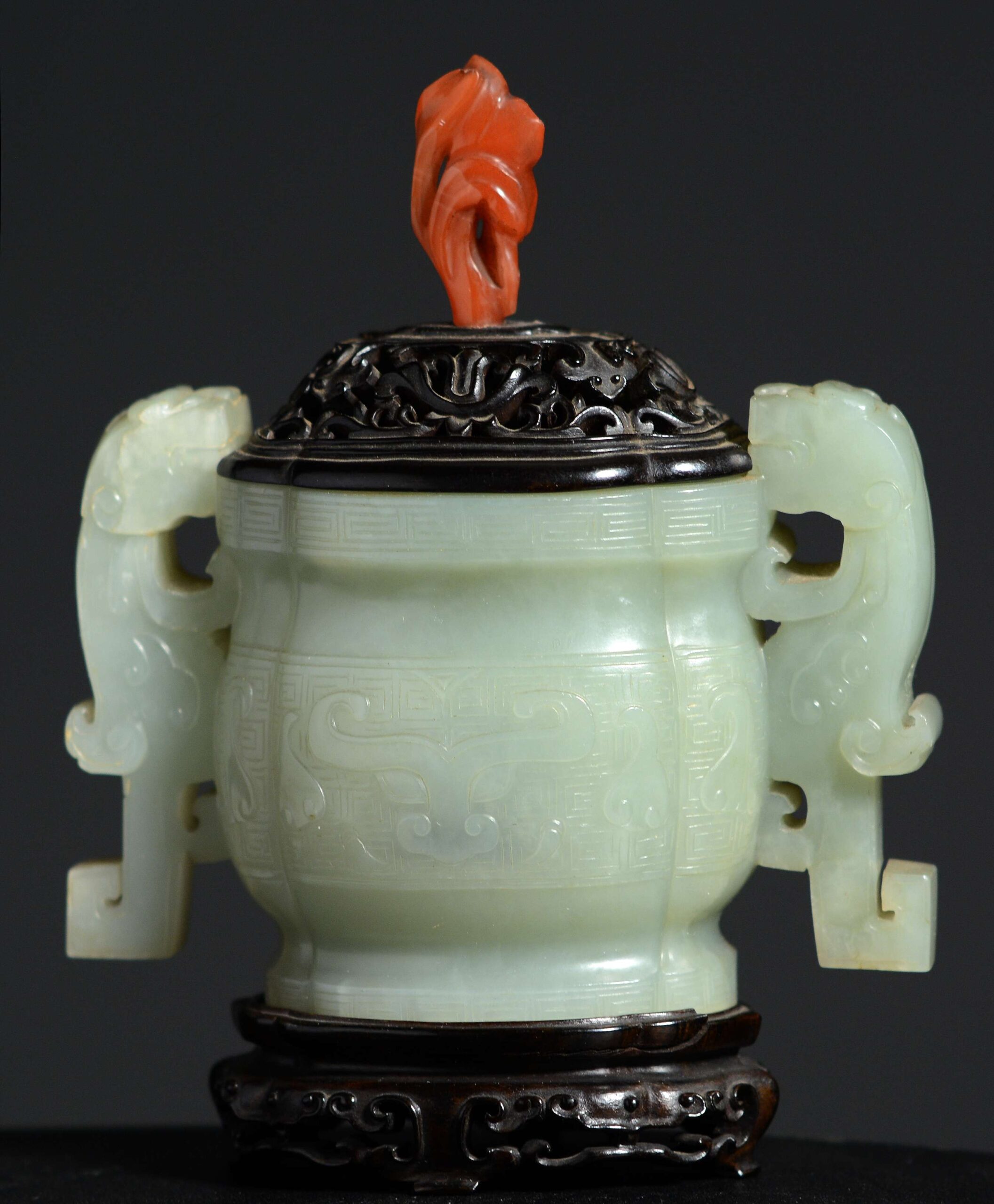 Finely carved jade two handled censer urn on wood stand